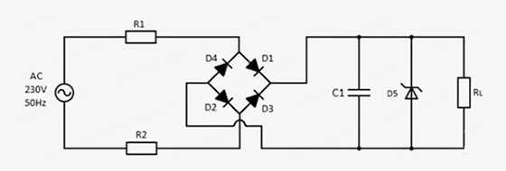 AC-DC電源電阻降壓電路拓?fù)淙缟纤?span>,其中電阻R1是降低大部分輸入電源電壓的關(guān)鍵元件?,F(xiàn)在要做的是計(jì)算R1的值以降低電壓,從而在特定電流值下獲得所需的負(fù)載兩端電壓。該電路首先通過R1分壓,之后通過橋式整流器將交流電轉(zhuǎn)換為直流電,然后是電容濾波和齊納穩(wěn)壓二極管進(jìn)行穩(wěn)壓輸出。