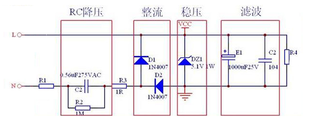 AC-DC電源阻容降壓電路由降壓-整流-穩(wěn)壓-濾波組成,在電路設(shè)計(jì)時(shí),應(yīng)先確定負(fù)載最大工作電流,通過此電流值計(jì)算電容容值大小,從而選取電容。與線性變壓器電源的區(qū)別是阻容降壓電源是通過負(fù)載電流選定電容,而線性變壓器電源是通過負(fù)載電壓和功率選定變壓器。